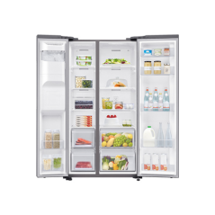 El refrigerador estadounidense Samsung RS65R5401M9 cuenta con refrigeración totalmente ventilada que garantiza una temperatura constante y un reajuste de cualquier cambio de temperatura en promedio de 4 a 6 veces más rápido que un dispositivo estándar. Este refrigerador americano está equipado con un dispensador de agua dulce, cubitos de hielo y hielo picado.