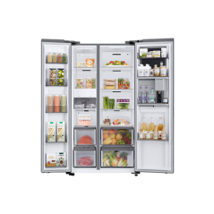 El refrigerador Samsung Side by Side RH69B8920S9 es un refrigerador americano-americano con frío ventilado que asegura una temperatura constante. Se beneficia de la tecnología "Twin Cooling" que gestiona de forma independiente el refrigerador y el congelador para un nivel de humedad perfecto. Este refrigerador está equipado con una fábrica de hielo automática doble y tecnología SpaceMax.